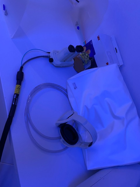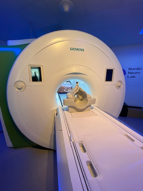 Det har vært et spennende prosjekt så langt og jeg har lært mye om ET, hvordan maskinlæring brukes i ET og mange nye måter å kode og funksjoner i python. Bildene viser VR-brillene med innebygget øye kameraer og et headsett som bruker luft (altså bare et tomt rør) for å transportere lyd til brukeren i MR-maskinen. I tillegg vises simulerings MR-maskinen og TV-skjermen som kan tilkobles.