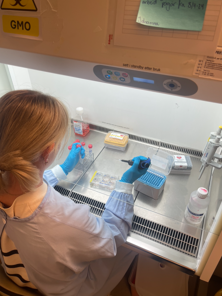 Her er et bilde av Lykke-May som jobber i LAF-benken med sine celleprøver. Vi gleder oss til resten av praksisperioden!