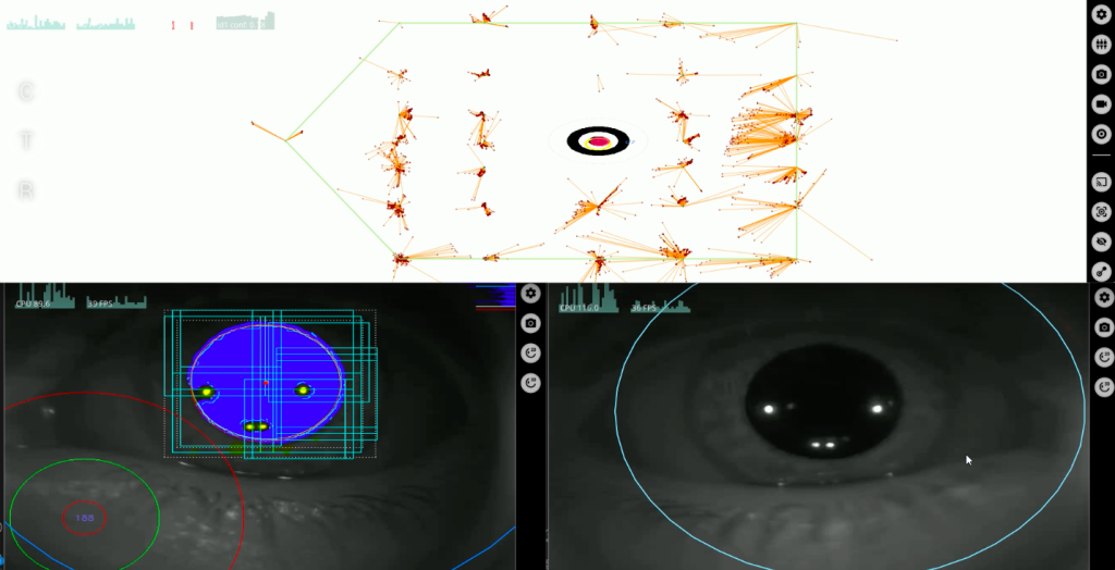 Den røde prikken på den hvite skjermen viser hvor algoritmen beregner at øynene ser, og på eye0 (venstre øye-video) ser man hvordan algoritmen fungerer for å detektere pupillen og dermed beregne gaze.