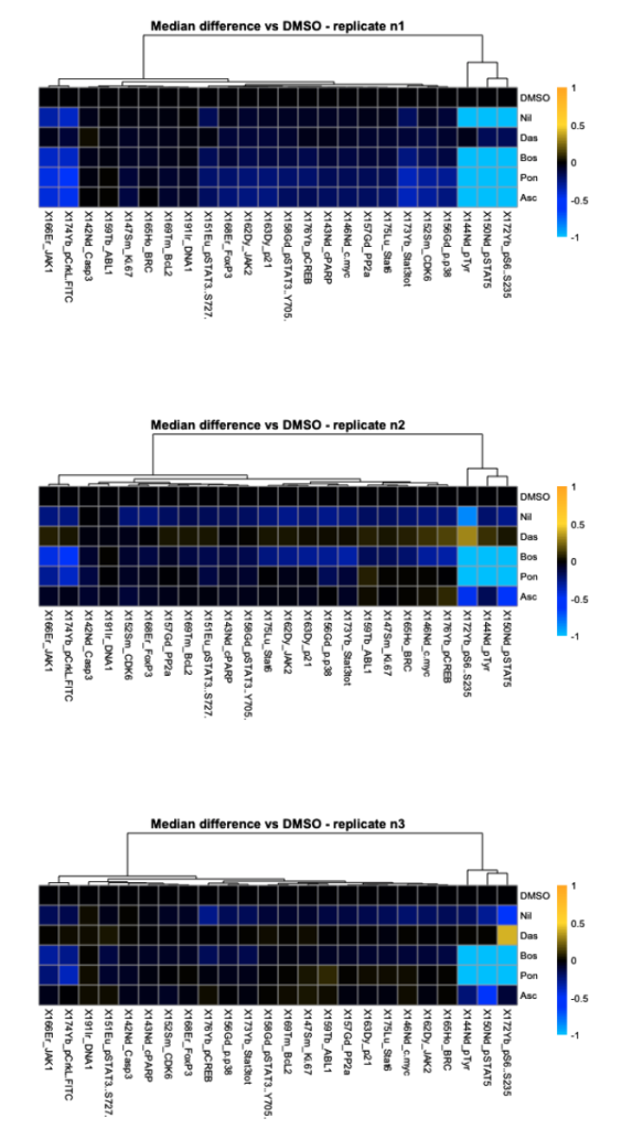 Sist dere hørte fra meg skrev jeg om labarbeidet vårt fra en studie på kronisk myelogen leukemi (CML). Da analyserte vi hvordan en kreftcellelinje responderte på ulike cytostatika (kreftmedisin) med 1 time virkningstid. Når prøvene våre var klare for analyse ble de kjørt i CyTOF-en som produserer store mengder data. Det vi har gjort den siste tiden er dataanalyse av disse dataene for å undersøke virkningen av de forskjellige kreftmedisinene.