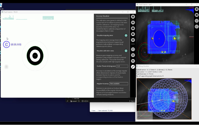 Figur viser Pupil Labs Capture under kalibrasjon. 3D-modell (nede til høyre). Pupill segmentering opp til høyre.
