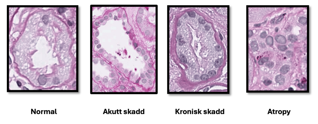 Figur 1: Utsnitt av nyrebiopsi med ulike typer skadet nyretubuli